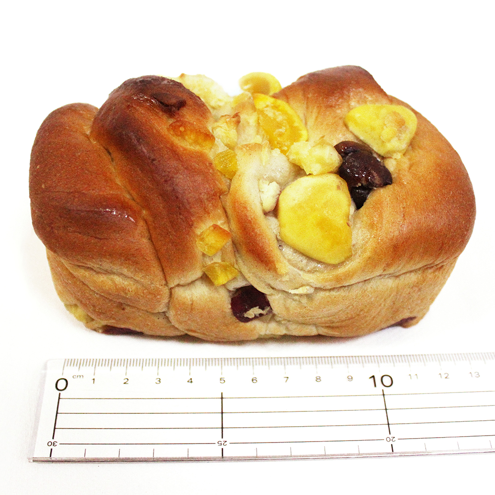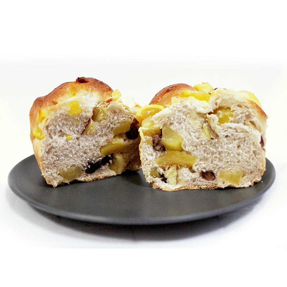 ふんわり香り立つはだか麦の生地に、栗とさつまいも、大納言を贅沢にたっぷり入れました。それぞれの素材のやさしい甘みが活きています。約11cm。